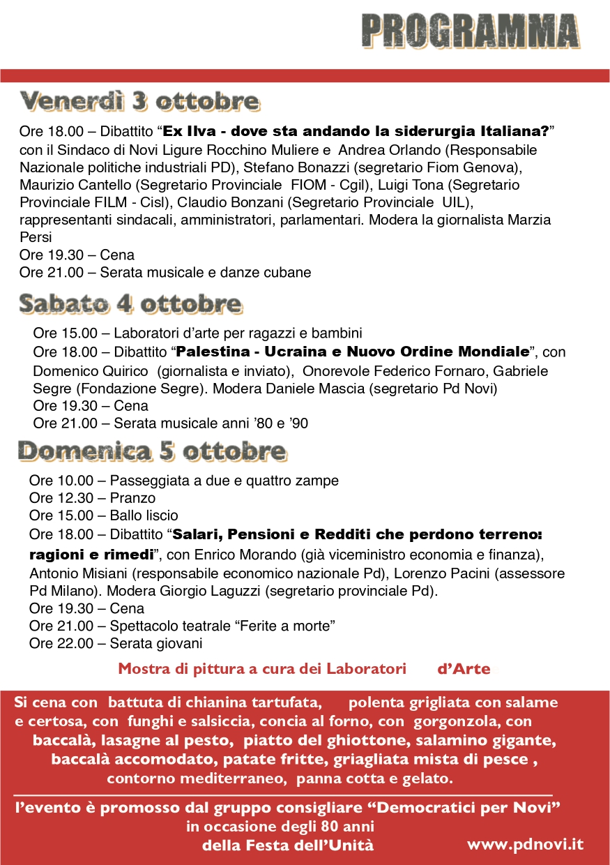 La giornata inizierà alle 10 con la “passeggiata a due e quattro zampe”, dedicata a cittadini e animali domestici. Dopo il pranzo e un pomeriggio di ballo liscio, alle 18 si terrà l’incontro “Salari, pensioni e redditi che perdono terreno: ragioni e rimedi”, con il viceministro Enrico Morando, Antonio Misiani (responsabile economico PD) e l’assessore milanese Lorenzo Pacini. La serata proporrà la rappresentazione teatrale “Ferite a morte”, ideata da Serena Dandini con la collaborazione della ricercatrice CNR Maura Misiti: una raccolta di monologhi ispirati a fatti di cronaca sul tema della violenza contro le donne. La chiusura della Festa sarà affidata a un’esibizione musicale dei Giovani Democratici.