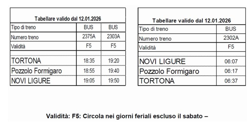 A partire dal 12 gennaio 2026 sarà attivato un nuovo servizio di autobus integrativi a supporto del collegamento ferroviario tra Novi Ligure e Milano. L’iniziativa prevede l’introduzione di tre autobus dedicati sulla tratta Novi Ligure–Tortona, in coincidenza con i treni da e per il capoluogo lombardo, con l’obiettivo di rafforzare il servizio nelle fasce orarie di maggiore affluenza.