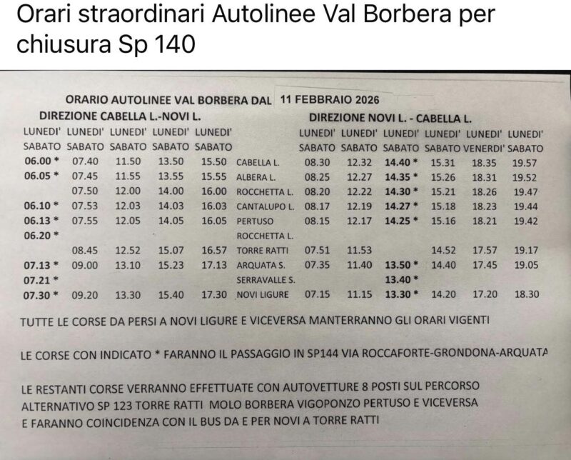 Nel frattempo, i disagi per i circa duemila residenti dei Comuni dell’alta valle si preannunciano significativi. Gli abitanti di Cantalupo Ligure, Albera Ligure, Rocchetta Ligure, Mongiardino Ligure, Roccaforte Ligure e Carrega Ligure sono costretti a utilizzare la provinciale 144 della Valle Spinti, con deviazione su Arquata Scrivia: un percorso più lungo e tortuoso, che comporta un sensibile aumento dei tempi di percorrenza.