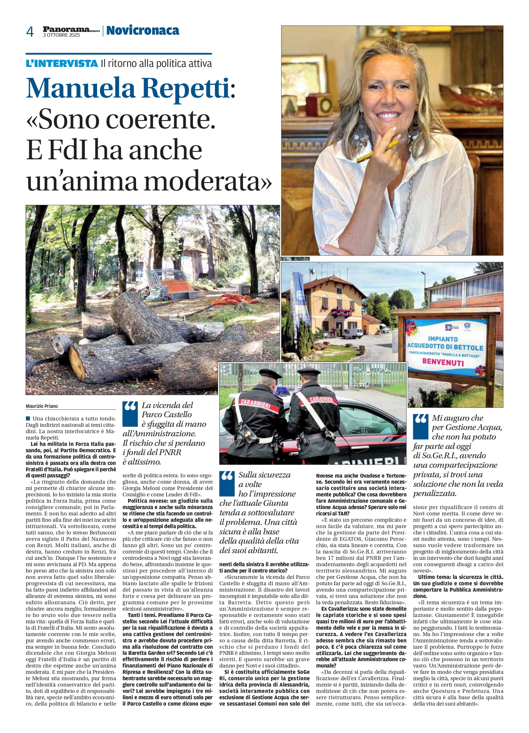 «A me piace parlare di ciò che si fa più che criticare ciò che fanno o non fanno gli altri. Sono un po’ controcorrente di questi tempi. Credo che il centrodestra a Novi oggi stia lavorando bene, affrontando insieme le questioni per procedere all’interno di un’opposizione compatta. Penso abbiano lasciato alle spalle le frizioni del passato in vista di un’alleanza forte e coesa per delineare un programma comune per le prossime elezioni amministrative».