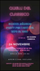Venerdì 24 novembre, dalle ore 20, presso la Tenuta San Giorgio di Serravalle Scrivia, si svolgerà una festa del Liceo Doria per riunire le classi dei nati tra il 1970 e il 1980 compresi.